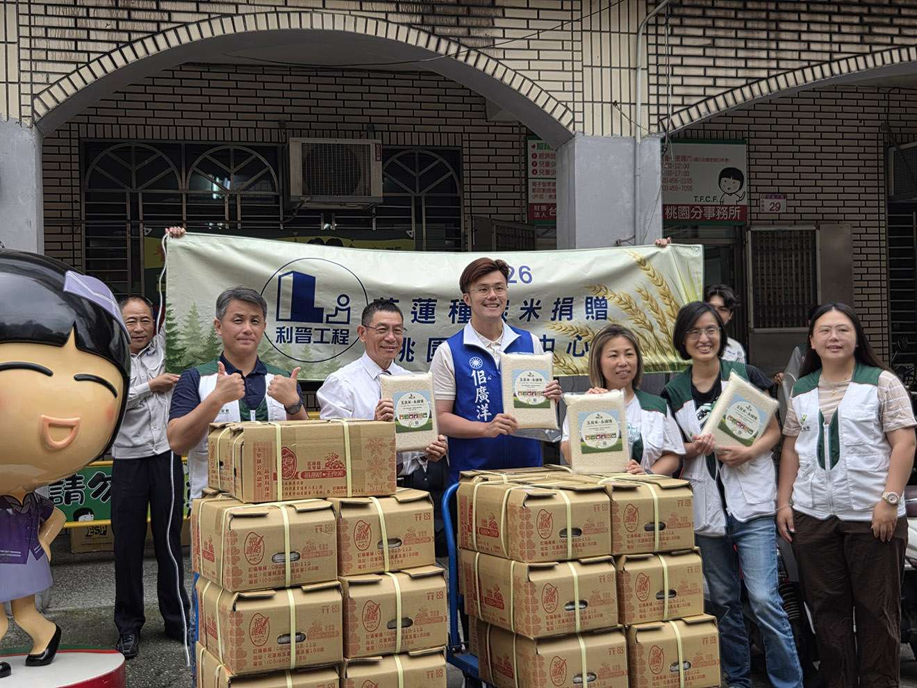 桃園市桃園家扶中心今(16)日上午在中壢區舉辦捐贈白米物資儀式,利晉工程總經理郭敏川、立委萬美玲服務處主任佀廣洋率團隊帶來3000公斤花蓮玉里有機米,捐贈桃園13區經濟弱勢受扶助家庭食用,郭敏川表明該公司關懷弱勢團體捐贈不只這一次,承諾該公司今(115)年公益行動將持續捐助4家慈善團隊,為社會盡一分心力。